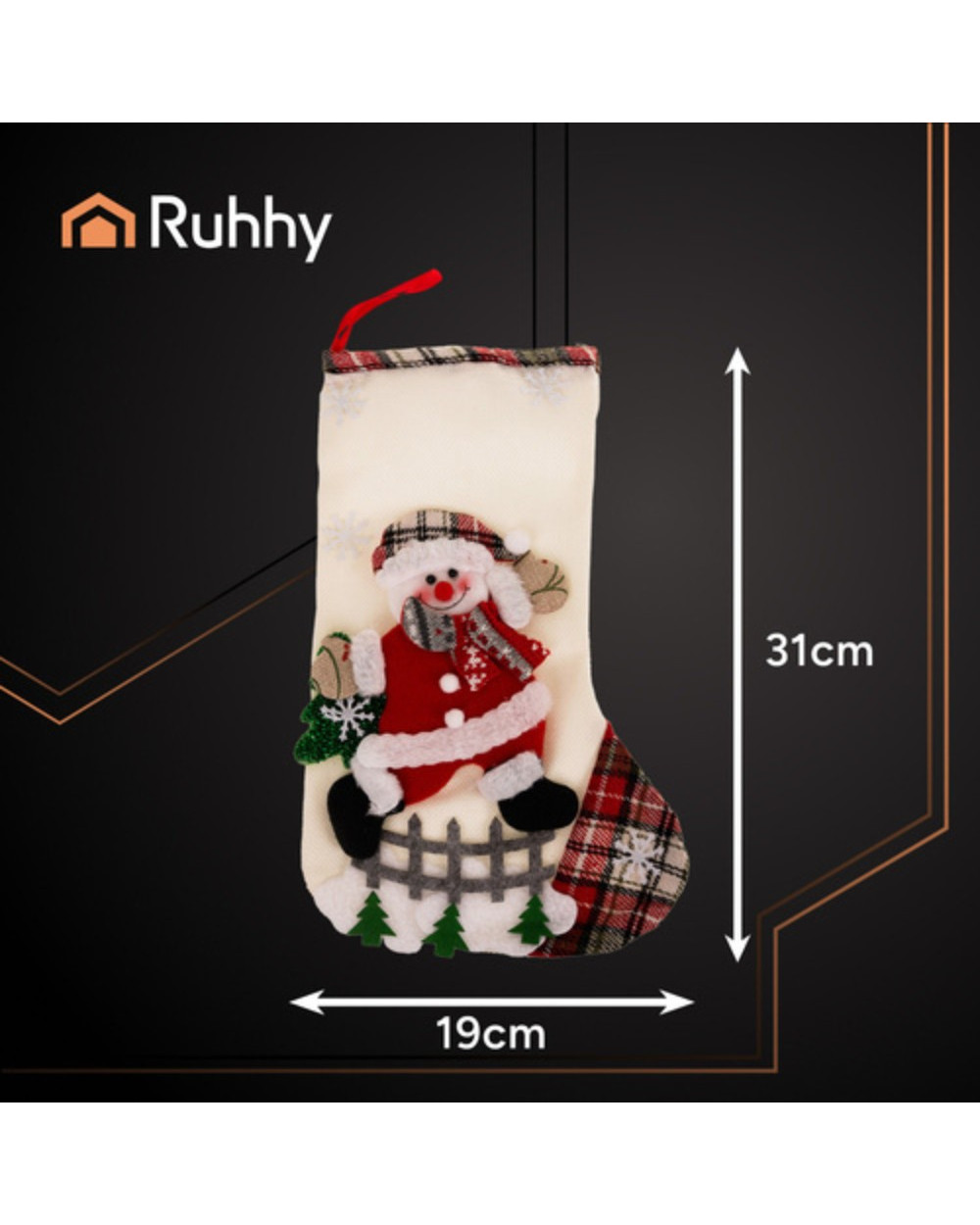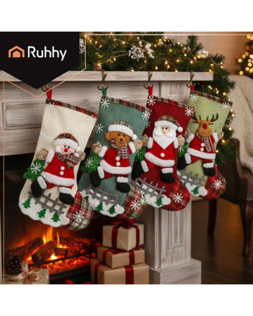 RUHHY prekės ženklo kalėdinės kojinės – tai puiki šventinio interjero detalė ir originalus būdas supakuoti dovanas. Keturi skirtingi raštai (Kalėdų Senelis, elnias, sniego senis ir meškiukas) sukuria jaukią, magišką atmosferą, o klasikinės kalėdinės spalvos lengvai dera su kitomis dekoracijomis. Rinkinys leidžia sukurti vientisą, akį traukiančią kompoziciją židinyje ar bet kurioje namų vietoje.