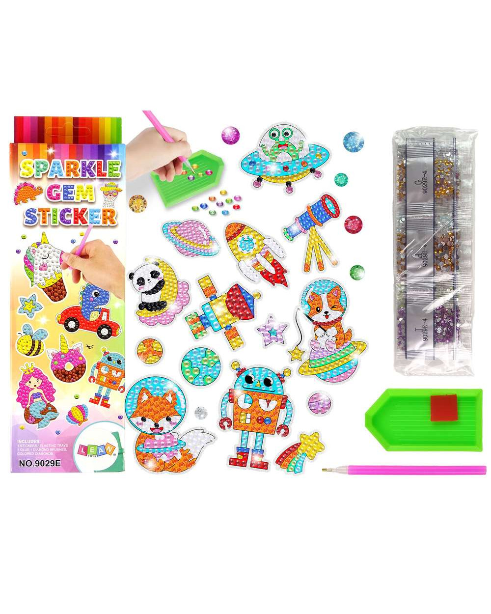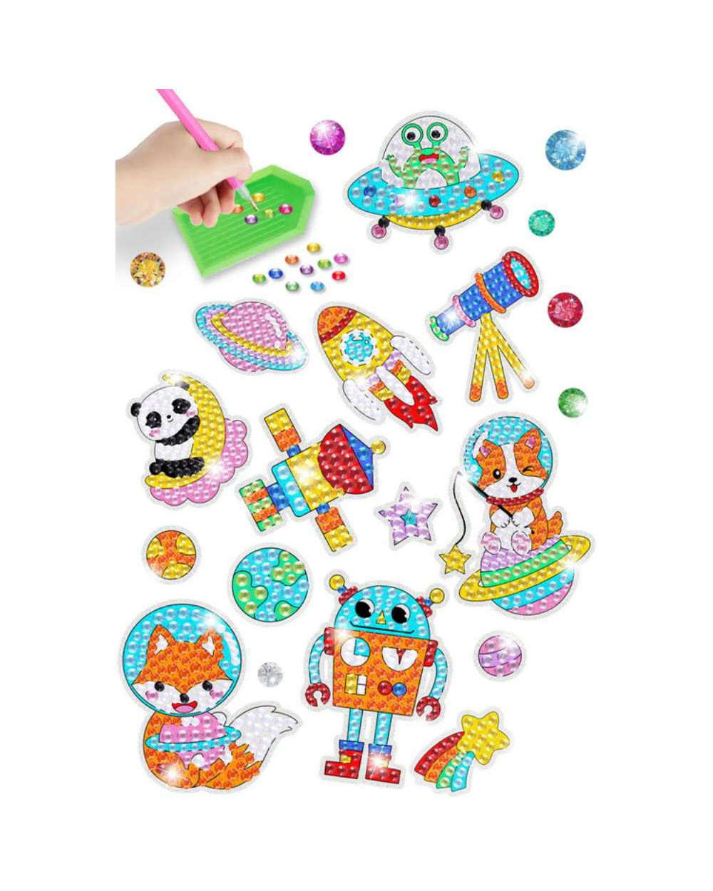 Leiskite vaikui sukurti žėrinčius kosmoso stebuklus! Klijuodami mažus deimantėlius, vaikai lavina kruopštumą, smulkiąją motoriką, kantrybę ir koncentraciją, o galutinis rezultatas tampa spindinčia kambario dekoracija.