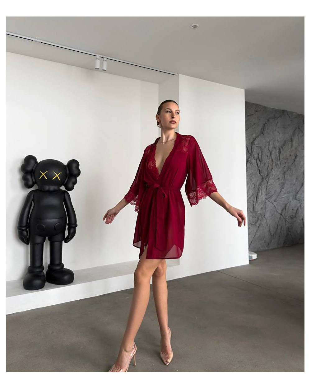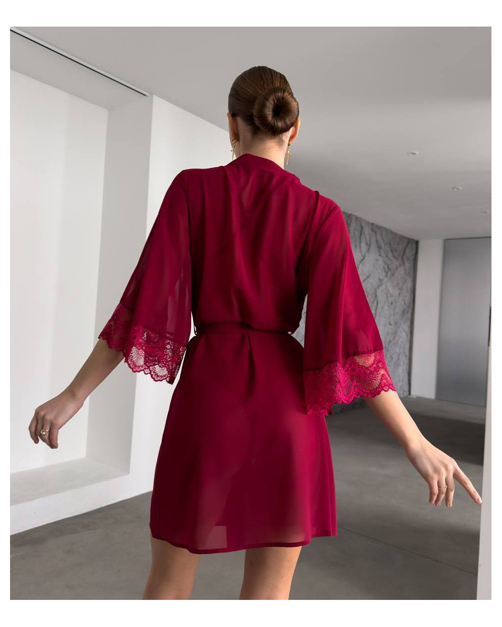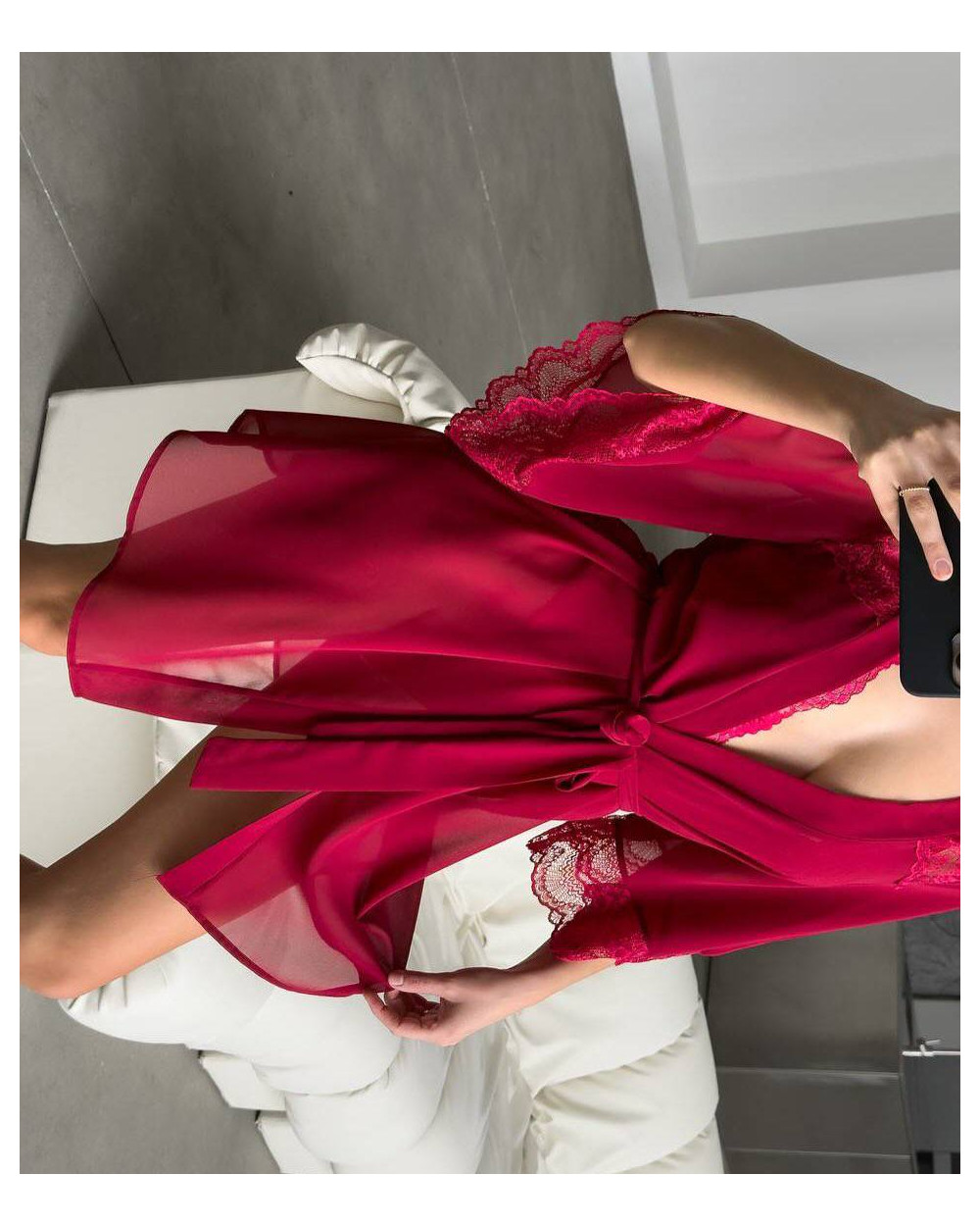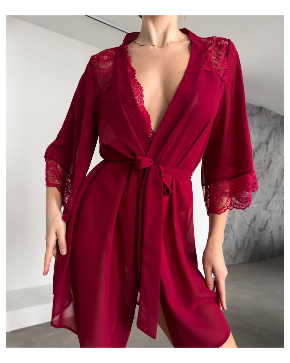 Chalatas pagamintas iš aukštos kokybės smulkaus šilkinio tinklelio, todėl yra ypatingai švelnus, lengvas ir malonus odai. Permatoma, ažūrinė tekstūra suteikia įvaizdžiui lengvumo ir romantikos, o laisvas siluetas dailiai krenta, pabrėždamas figūros linijas.