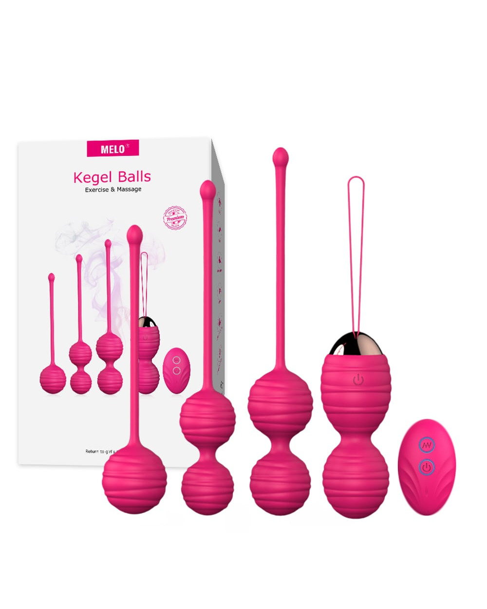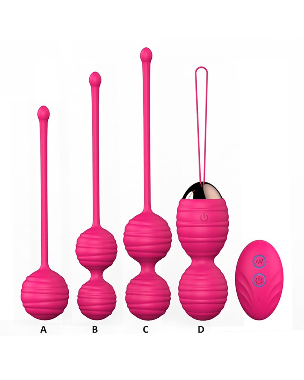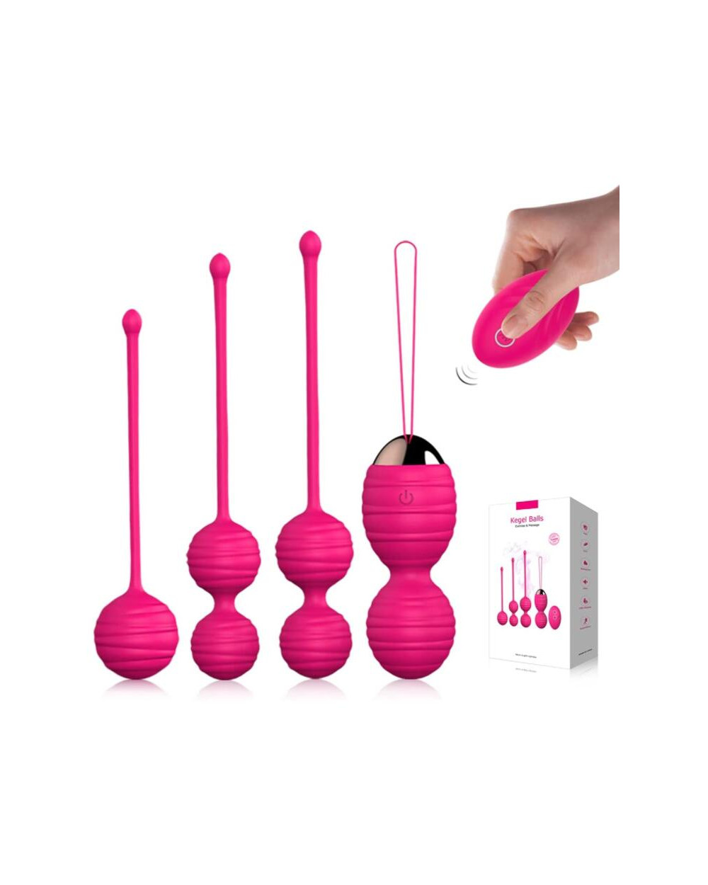 Keturių vibruojančių vaginalinių kamuoliukų rinkinys, skirtas makšties raumenų treniruotėms ir stiprinimui. Rinkinyje yra keturi skirtingo dydžio ir formos kamuoliukai, pagaminti iš ryškios rožinės spalvos silikono. Vienas iš kamuoliukų yra vibruojantis, valdomas belaidžiu pulteliu, todėl jį galima naudoti tiek treniruotėms, tiek malonumui. Kamuoliukai yra su patogiomis kilpelėmis, palengvinančiomis ištraukimą. Šis rinkinys puikiai tinka pradedantiesiems ir pažengusiems, norintiems pagerinti makšties tonusą bei jautrumą.